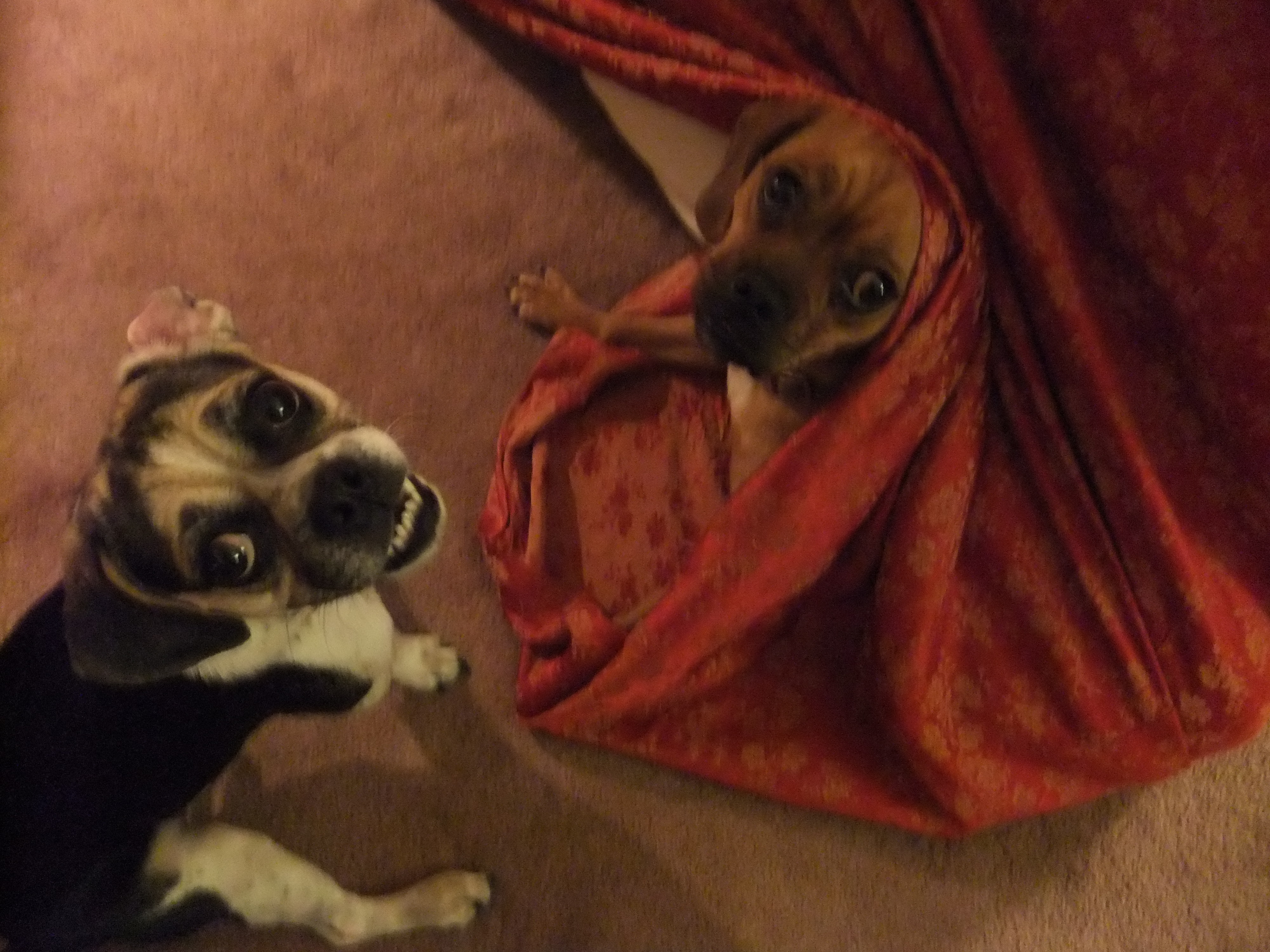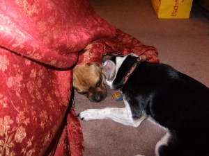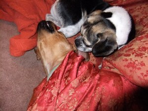 It takes somewhere in the neighborhood of forty-five minutes to reorient the comforter inside the cover. It’s slippery. It’s askew. Those puppies, they think it’s a game. They pounce on the lumps. They try to crawl back inside.