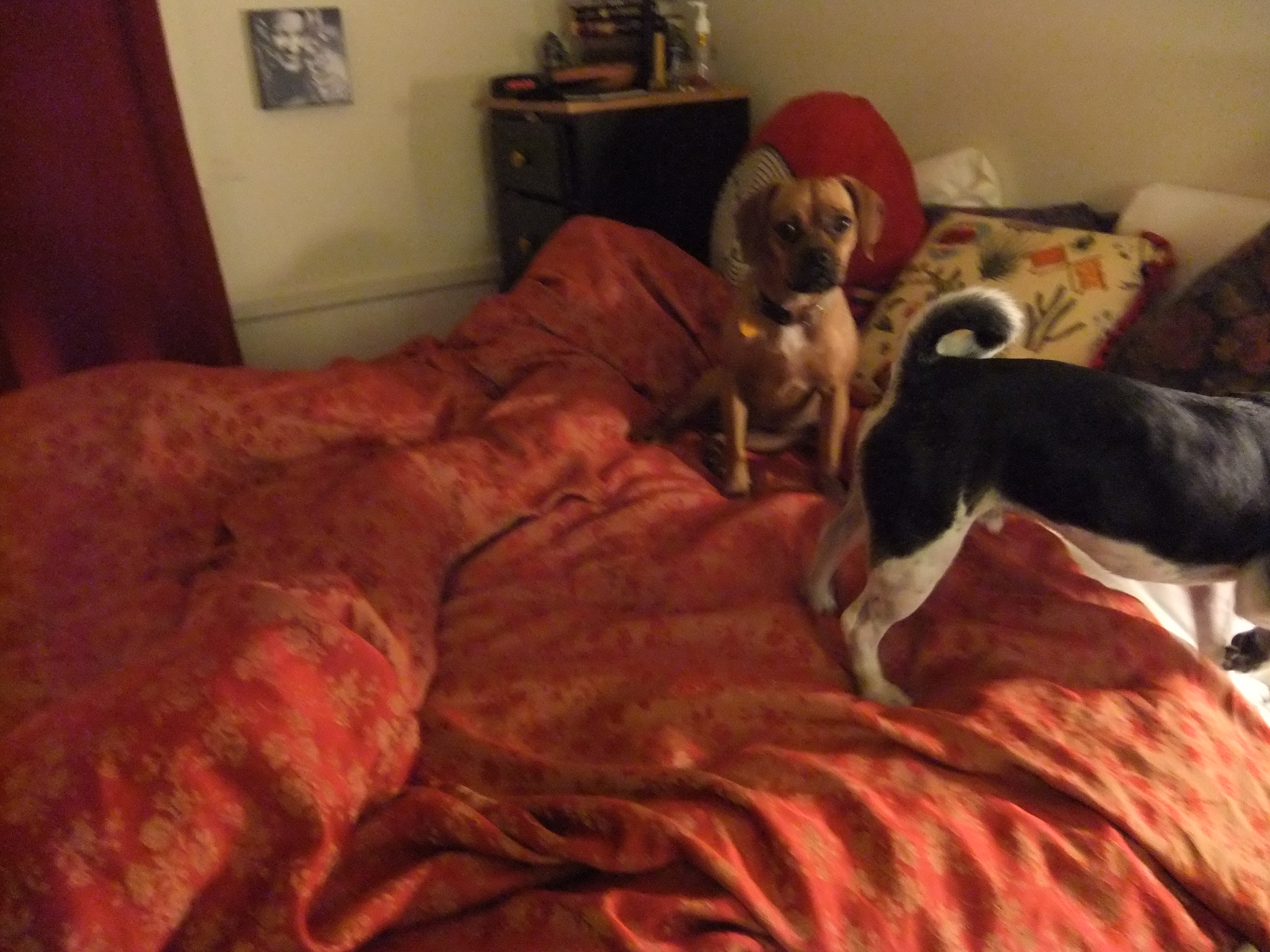 That’s it in the middle there. The down comforter. The snaky lump now cutting diagonally across the bed. Prolapsing out the end.
