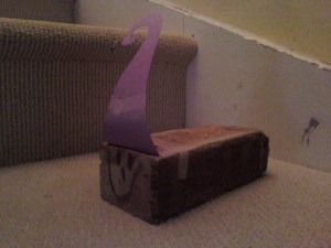 It’s a brick, in case you can’t tell that from the picture. A brick with a purple construction paper curlicue, ostensibly representing hair, and a really goddamn big smile.