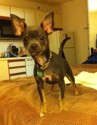 My boss has a ten-year-old Vizsla. Currently, a temporary bonus dog that belongs to the other guy who mixes my show is staying there: a ten-month-old teacup chihuahua named Vato (that’s Spanish for Dude).
