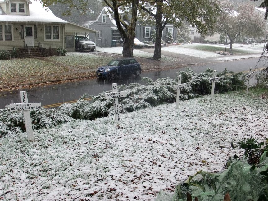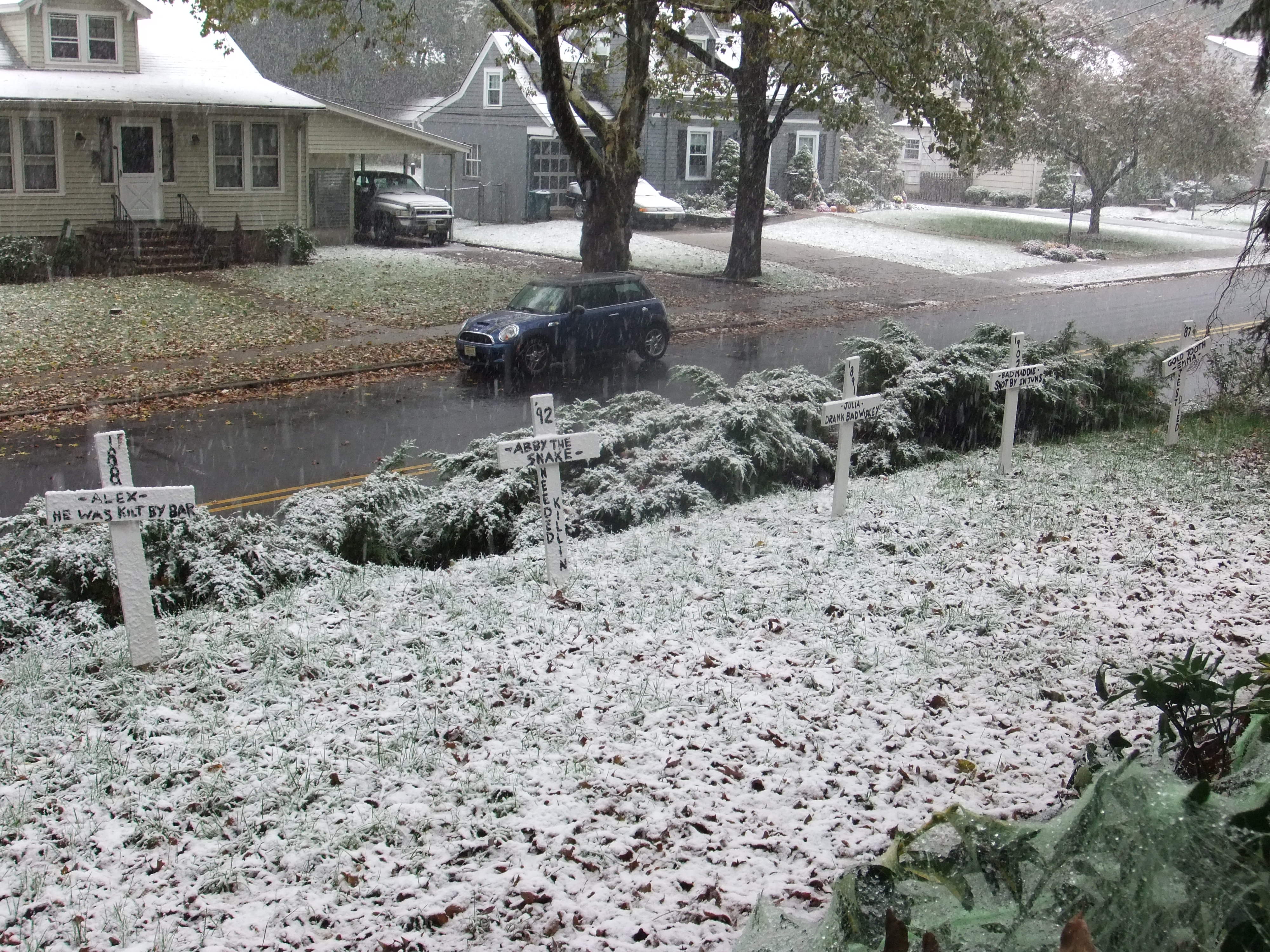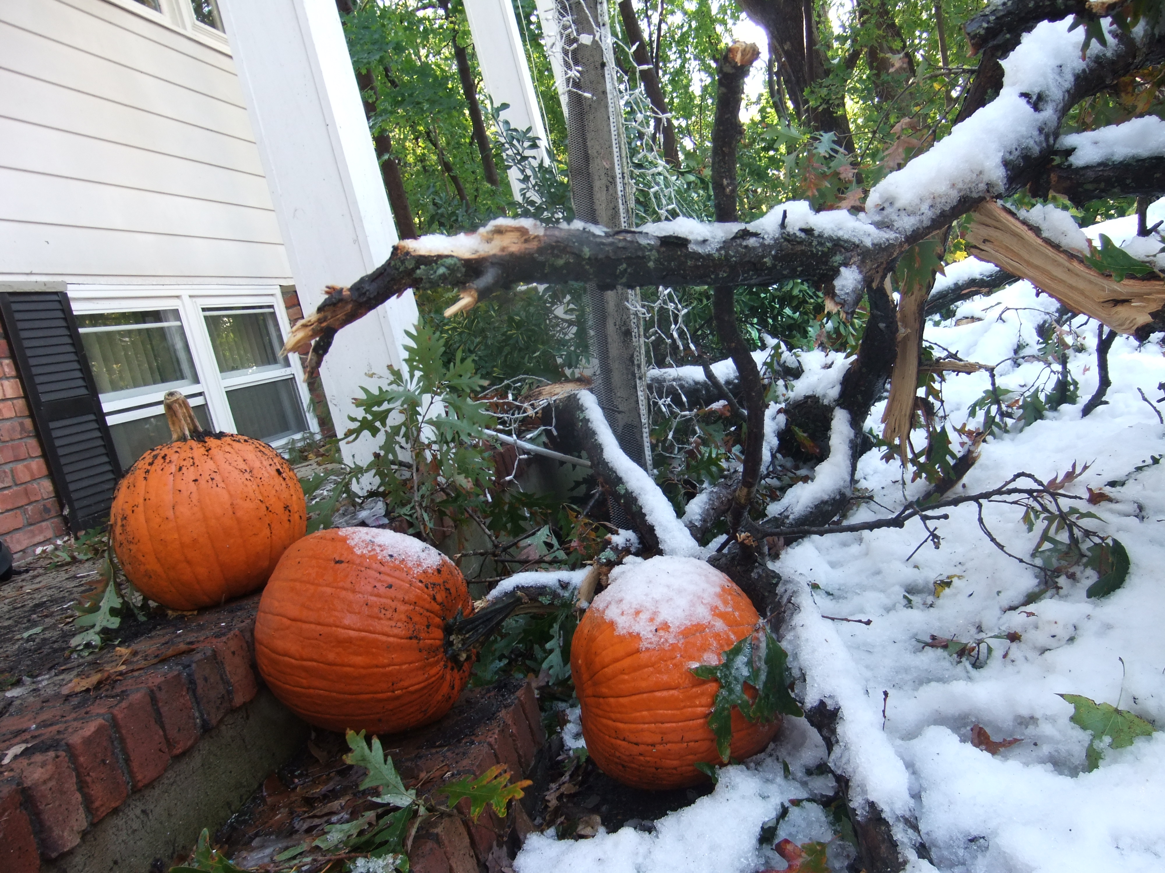 3. WHoah! Hold on…you live in…Jersey? I am down further south, just outside of Philly…we had NO SNOW. But, my red impatiens did die last night, and waking up this morning to see their dark green shriveled masses, was quite a concern. But those pics of your house…(shiver)) ouch! What a menace! The weather was surely out to get you, and diminish your Halloween Joy. But seriously…you live, like…90 minutes north of me! I had nothing but some cold! Agh! I heard we are in for a really nasty, cold, snowy winter.
