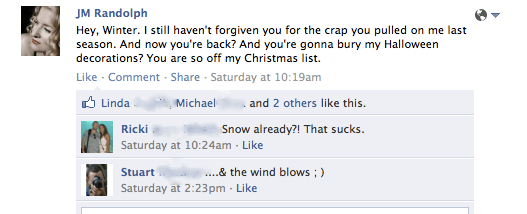 The winter storm that hammered the east coast this weekend was all our fault. Perhaps the fault of my family as a whole, or it may be that the blame can be placed squarely on my shoulders.