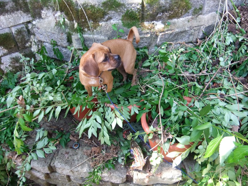 Casey managed to climb up on the little stone wall into the flower pots while simultaneously getting herself all tangled up and stuck. The part you can’t see are all the branches her leash is wrapped around.
