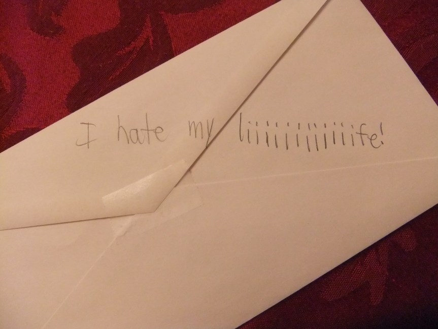 Because we work nights, we usually get home after the kids go to sleep. They leave us notes: tests that need to be signed, permission slips, requests for money, and random thoughts are all written out and laid on the dining room table.