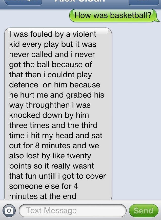 #5 had a basketball game on a Saturday when his Dad and I were both at work. I texted him at intermission to see how it went.