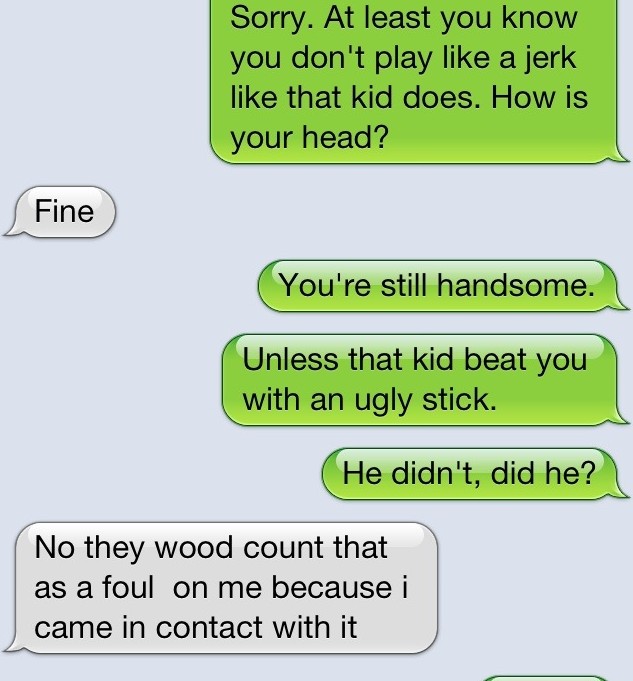 Me: Man, that sucks, bud. Sorry. At least you know you don’t play like a jerk like that kid does. How is your head?