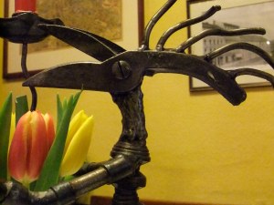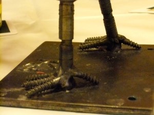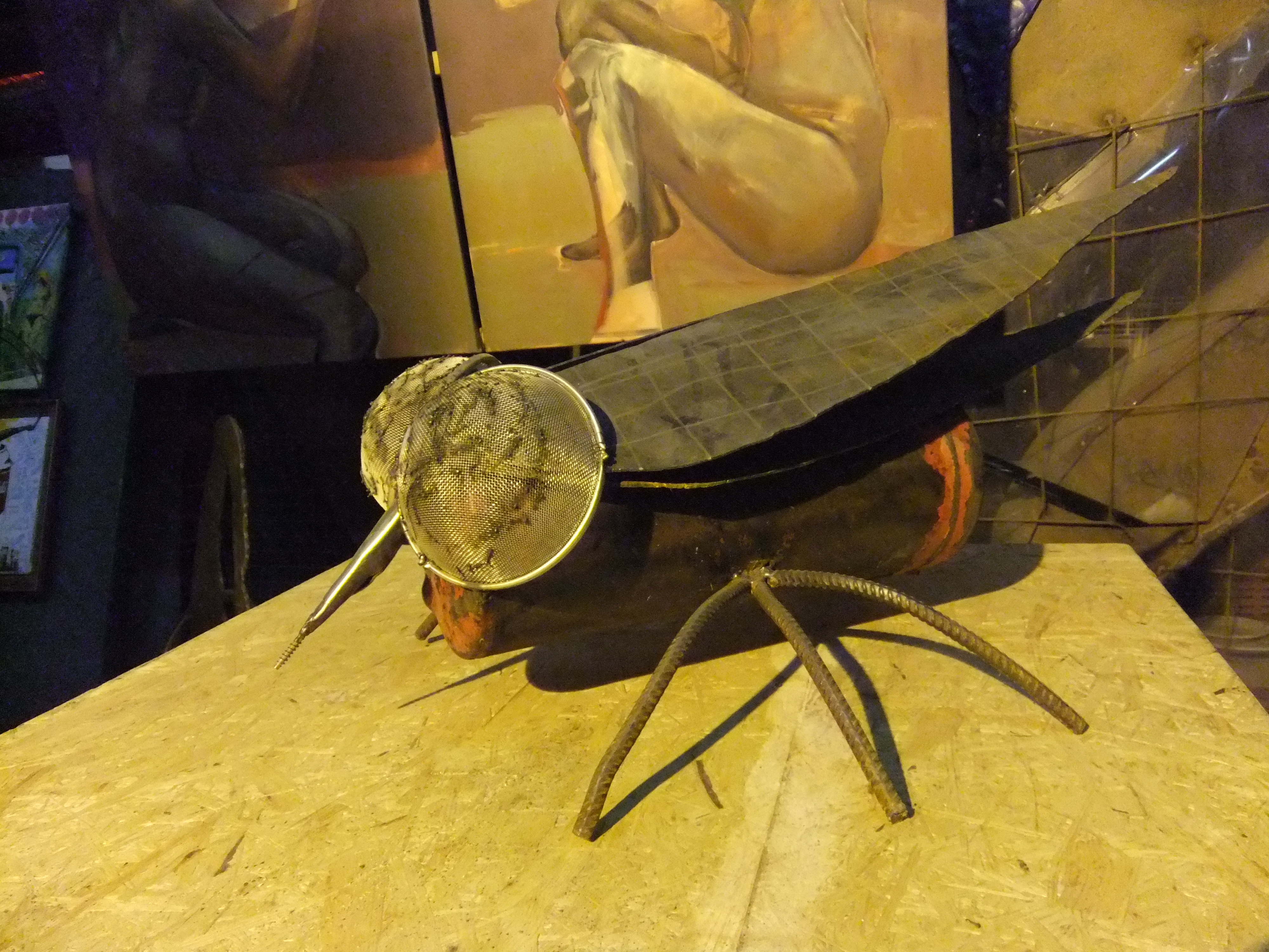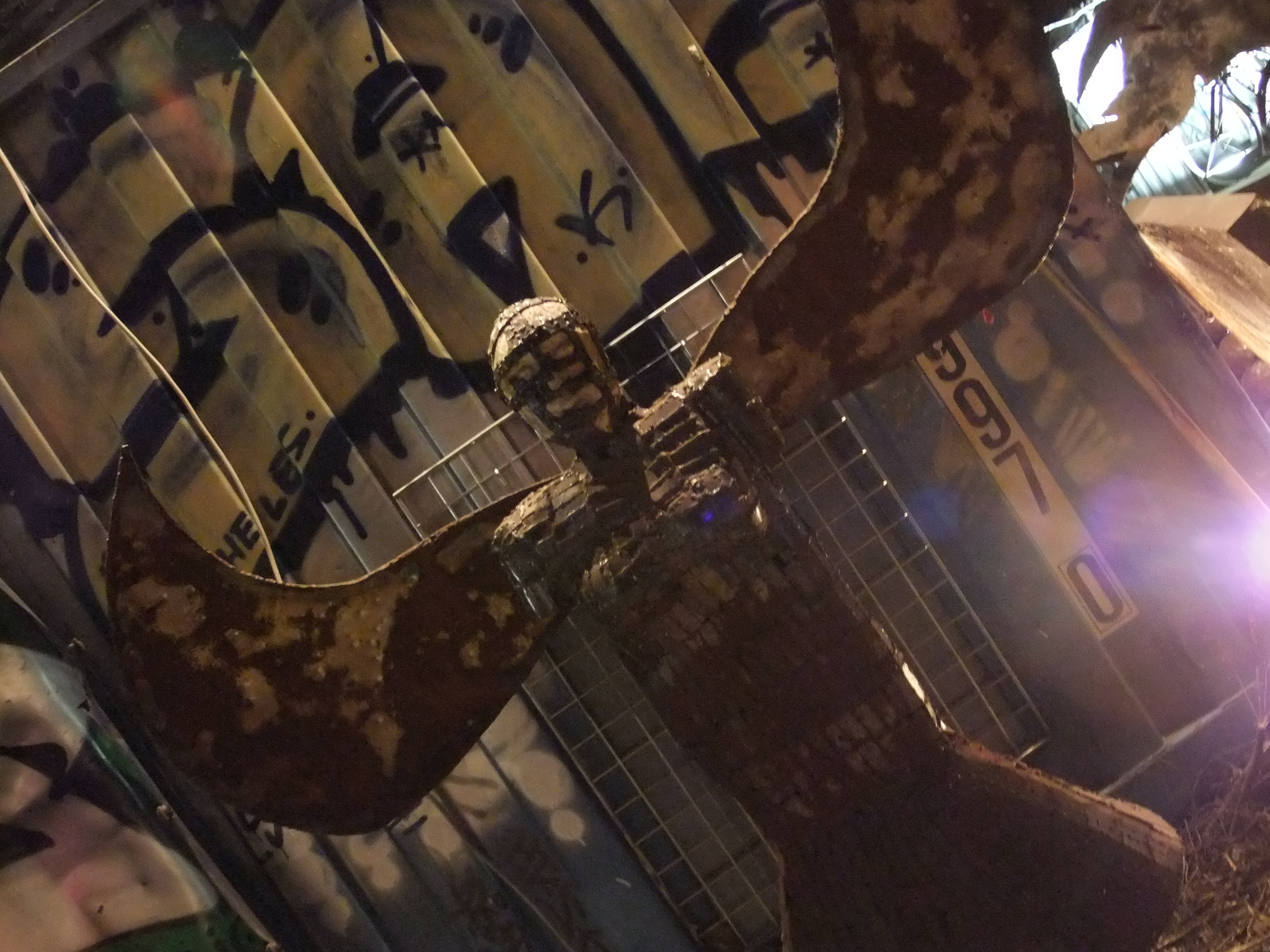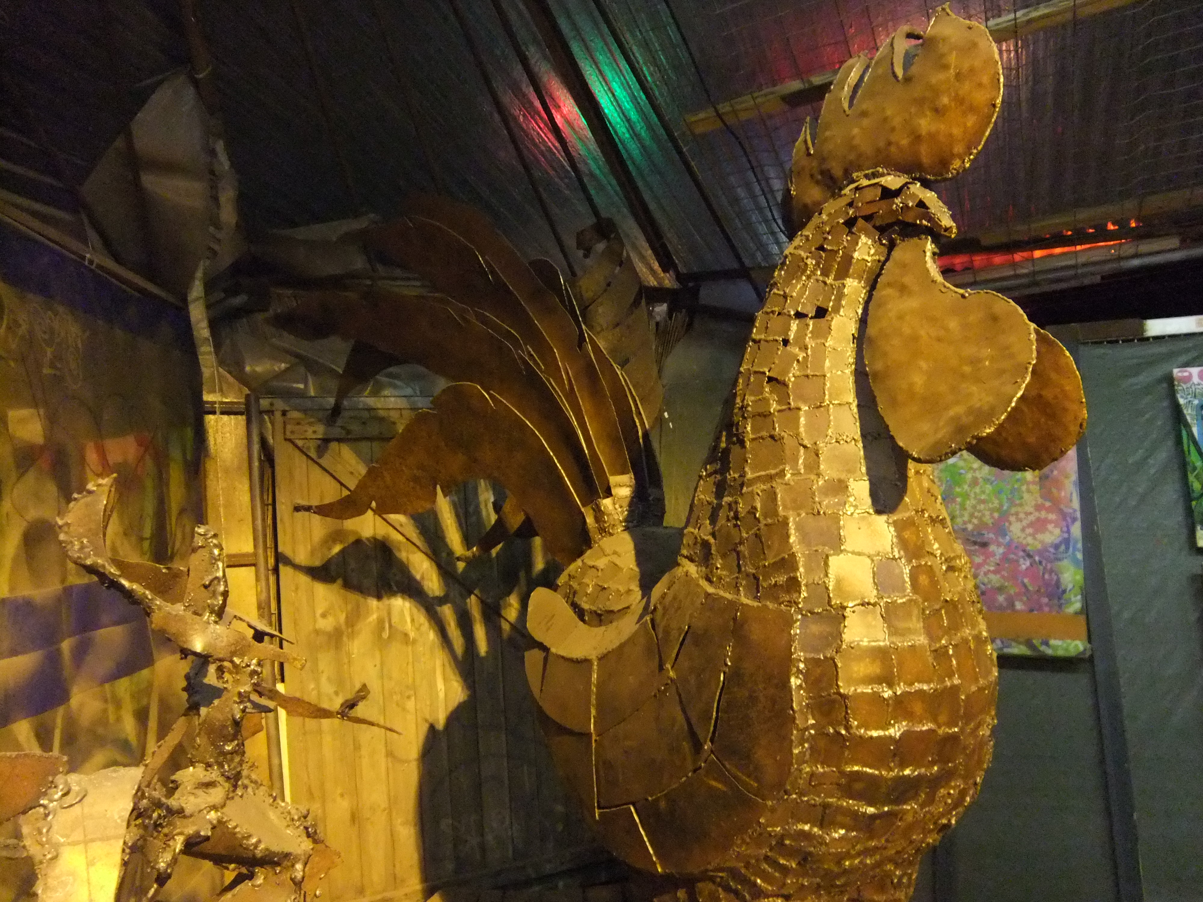 A chicken made out of various bits of metal, some identifiable, some not. I like his feet.