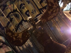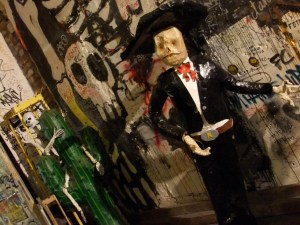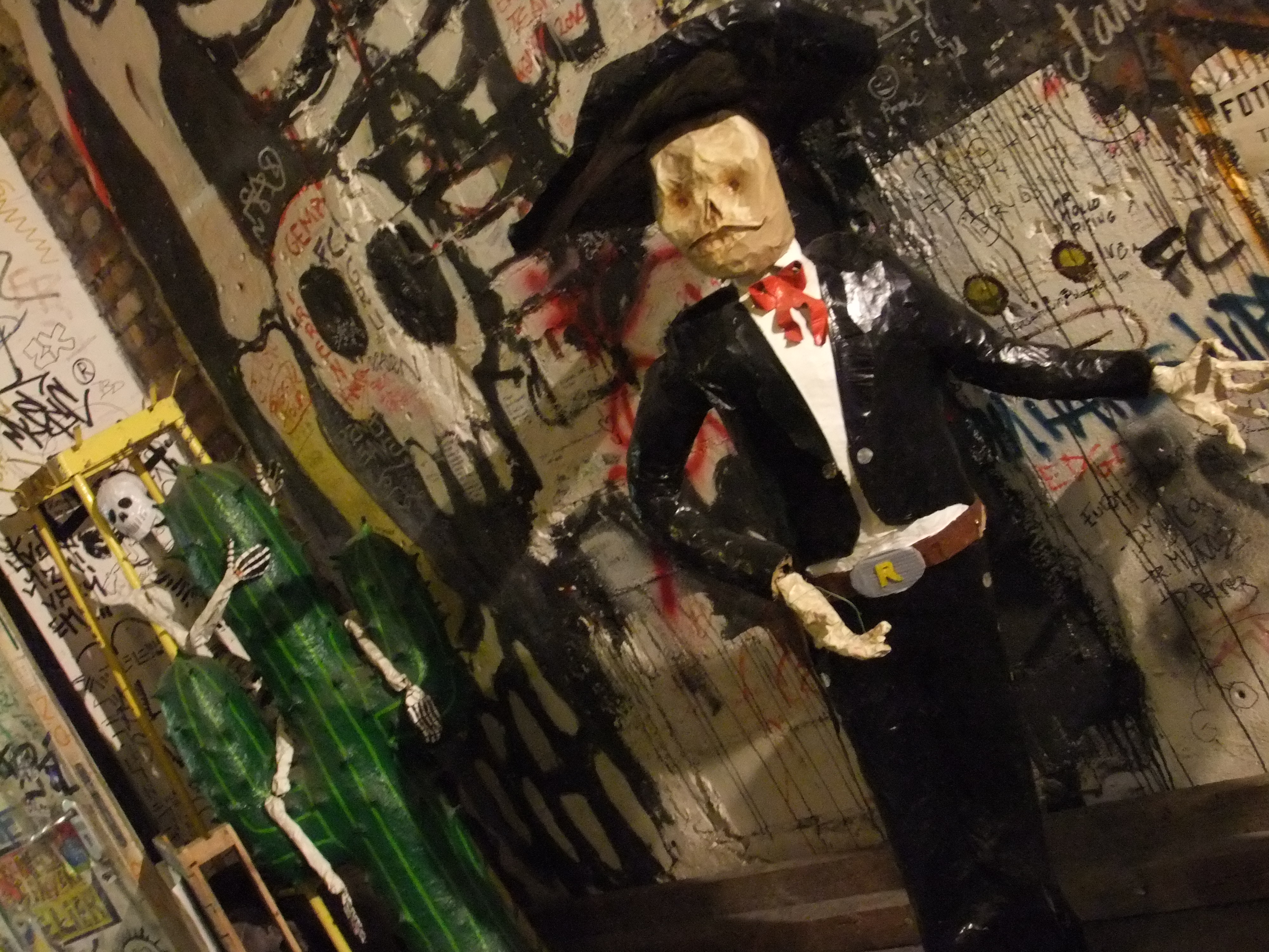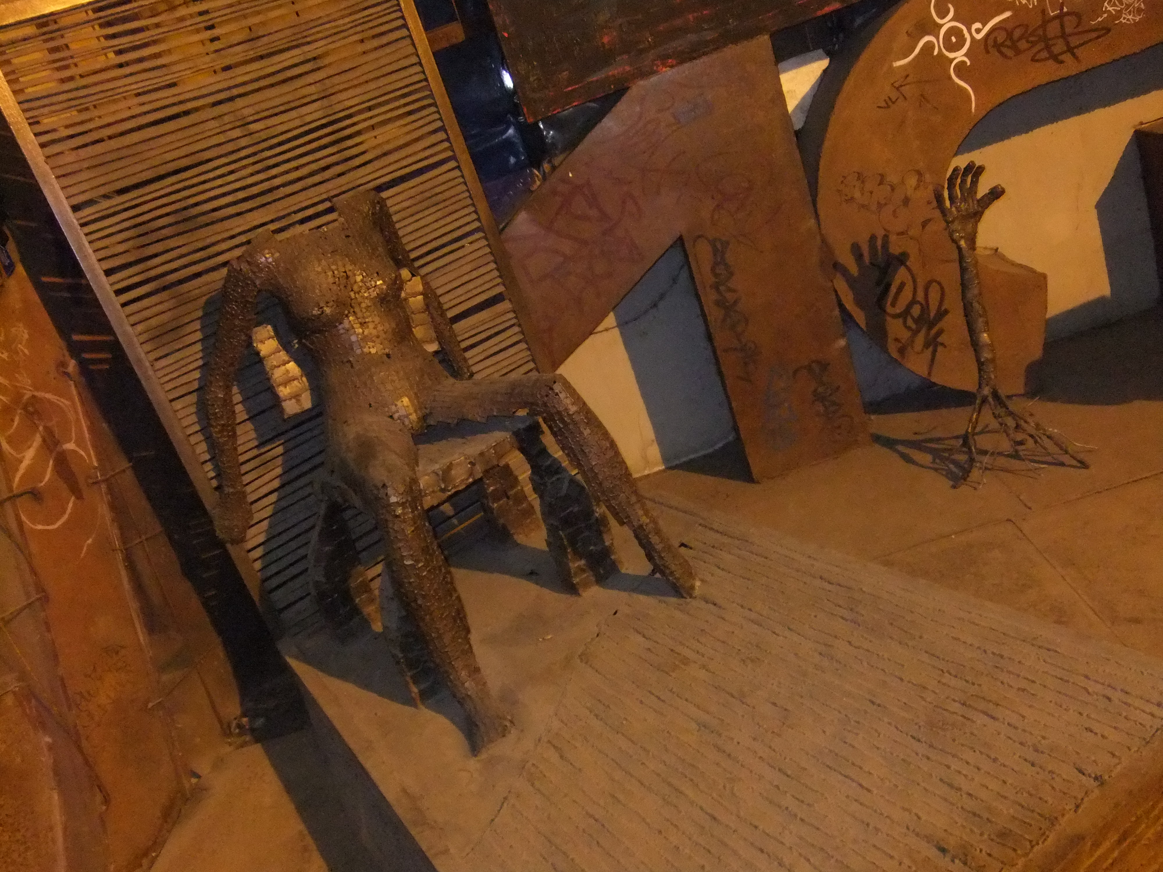 Picture if you will a dim, grafitti-covered room, cold, and heated only by a fire going in a giant head that looks eerily similar to those big rocks on Easter Island. It’s worth clicking on this picture for a closer look.