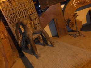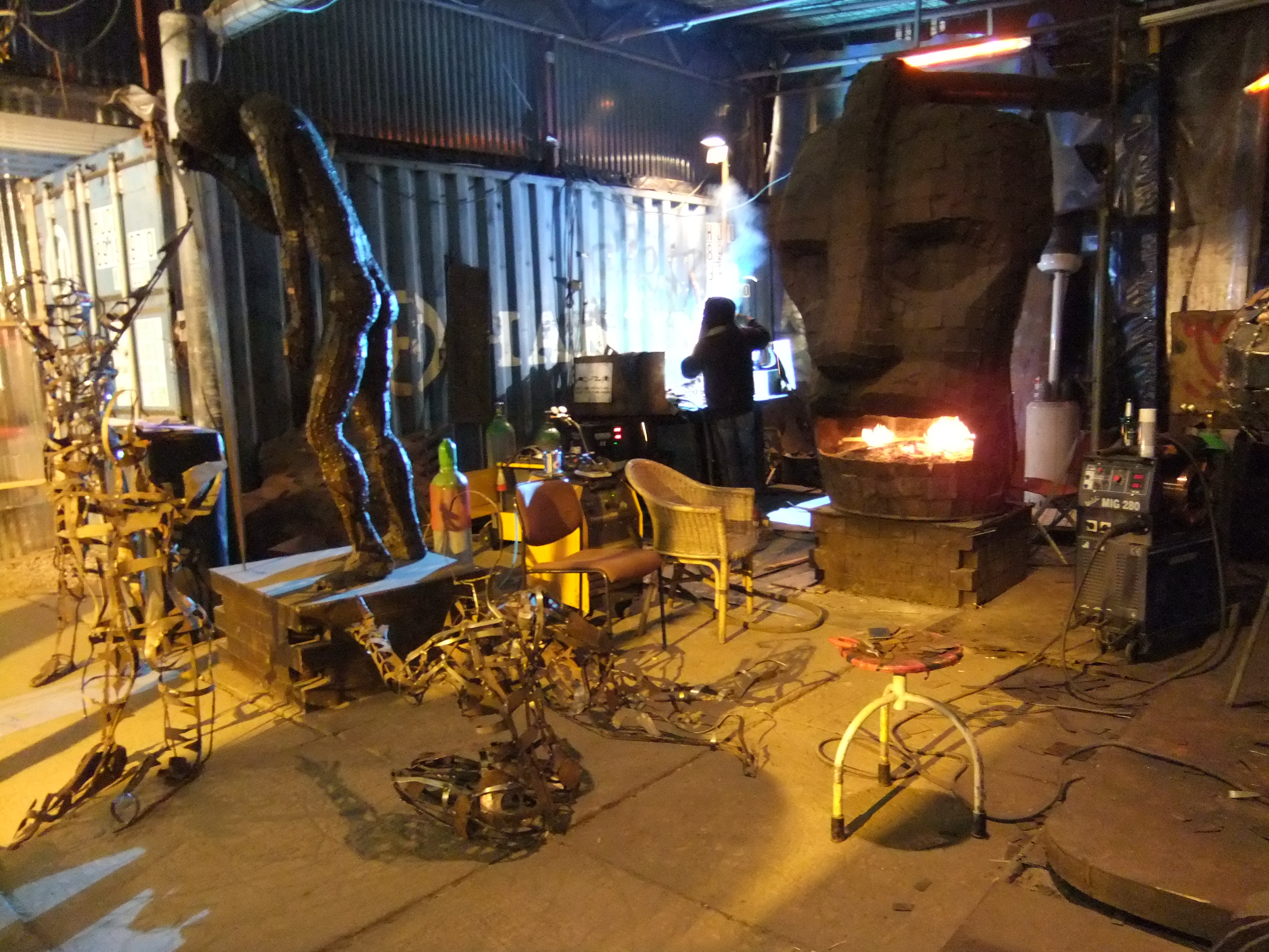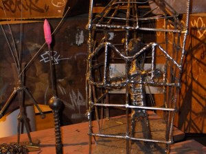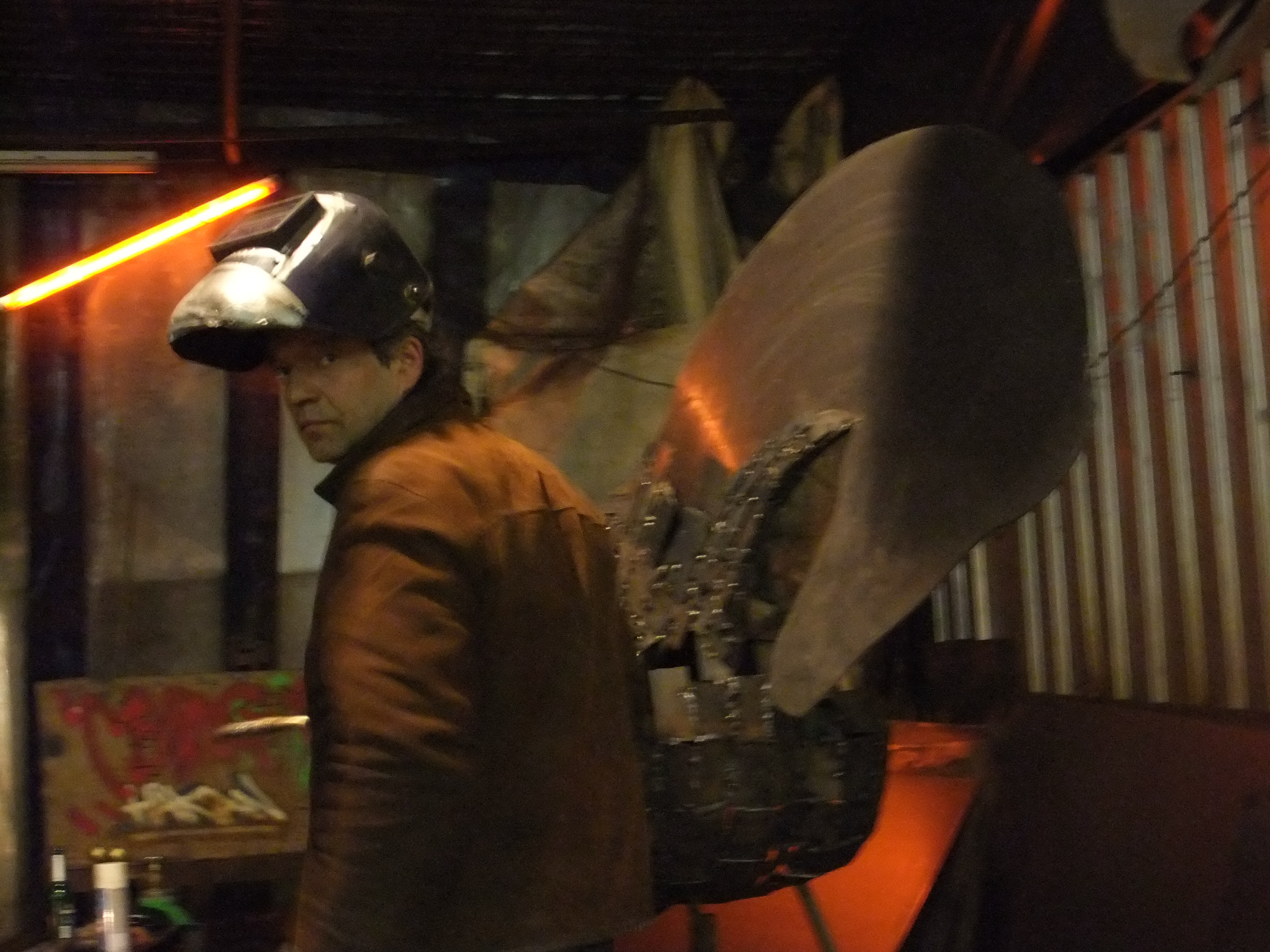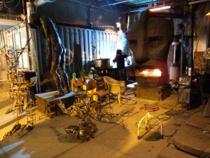 They’re working. Making art. Metal sculptures, from tiny to ginormous, out of various bits of random hardware- drill bits, ammo casings, gears, chains, screws, metal shavings. There is music: the original cast recording of Annie mixed down with a techno beat. If I were at a different time in my life I would have signed up to apprentice right there. Instead, I just took some pictures.