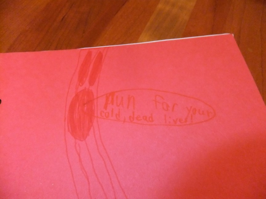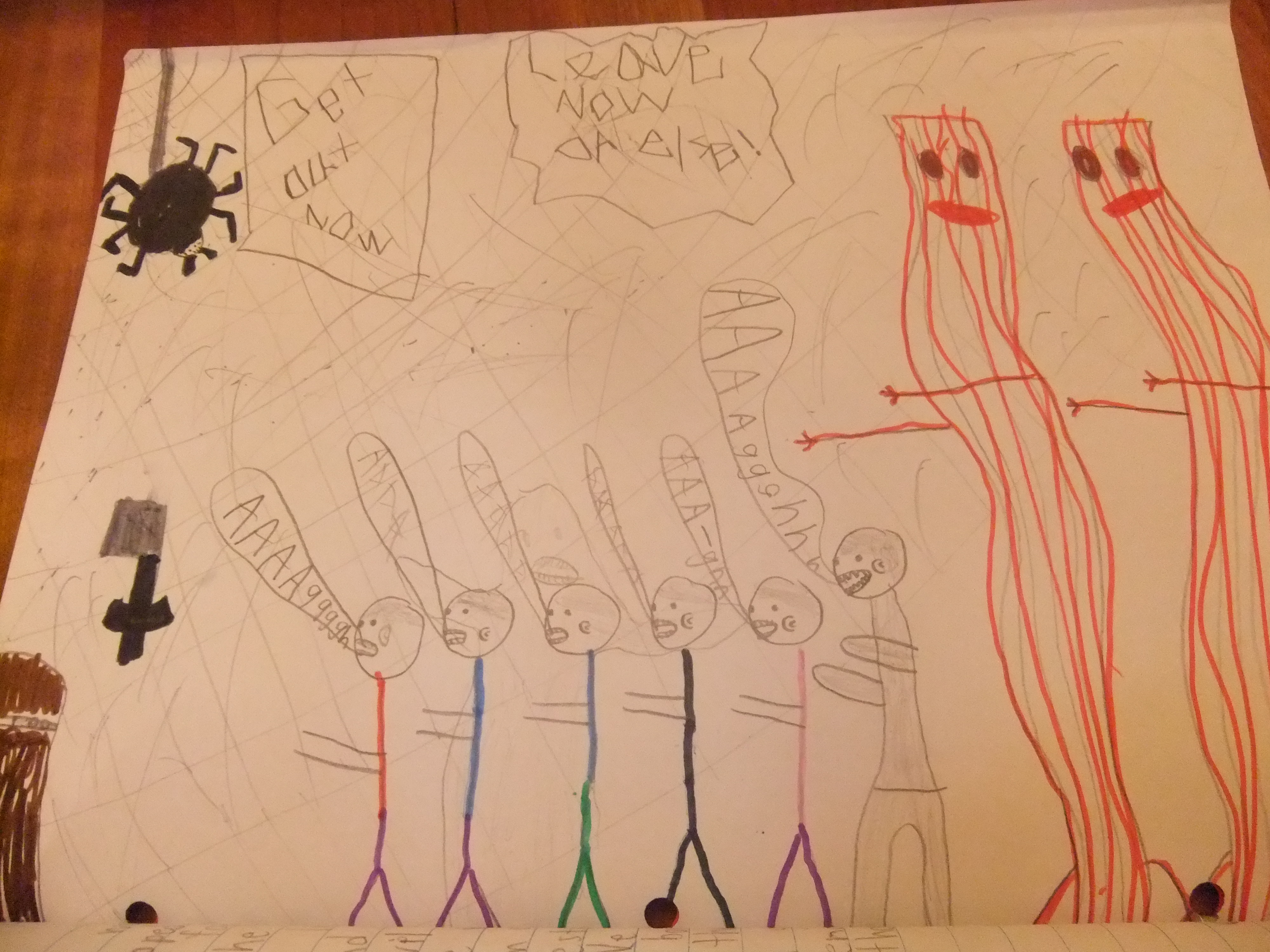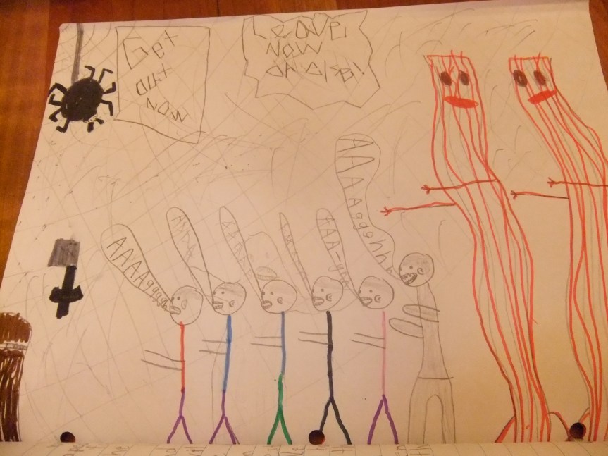 We bounced trough the scary house screaming the whole entire time. A big, spooky ghost came out of the wall, but we rushed right through his stomach and he disapeared. A big, bloody zombie jumped out of a coffin. I got a hold of Eathan and was about to eat him when I noticed an ax was on the wall, and I chopped the zombie’s bloody arm off. The zombie was completely bleeding. We sadly all lost all of our candy in the spooky, deadly haunted house.