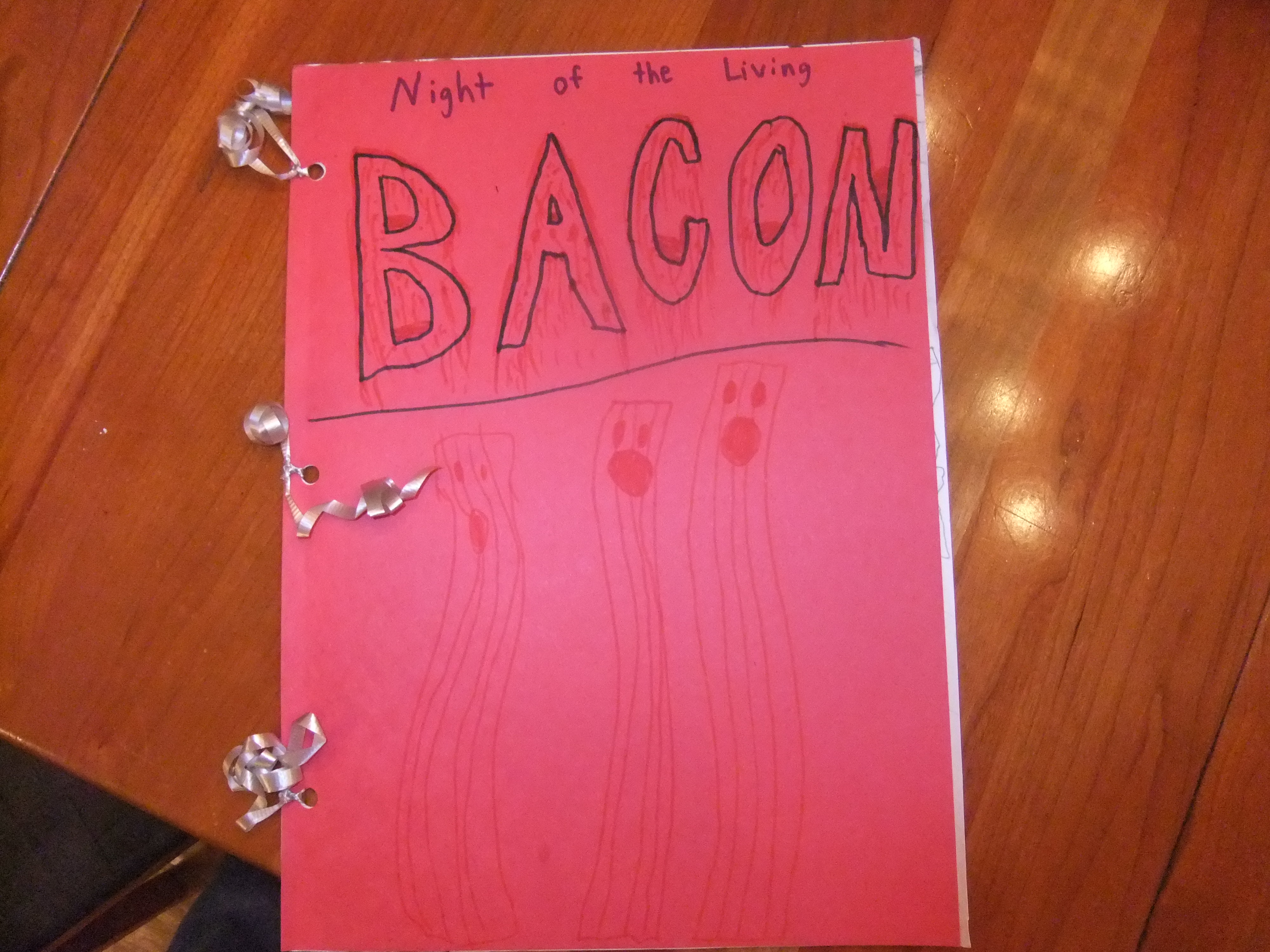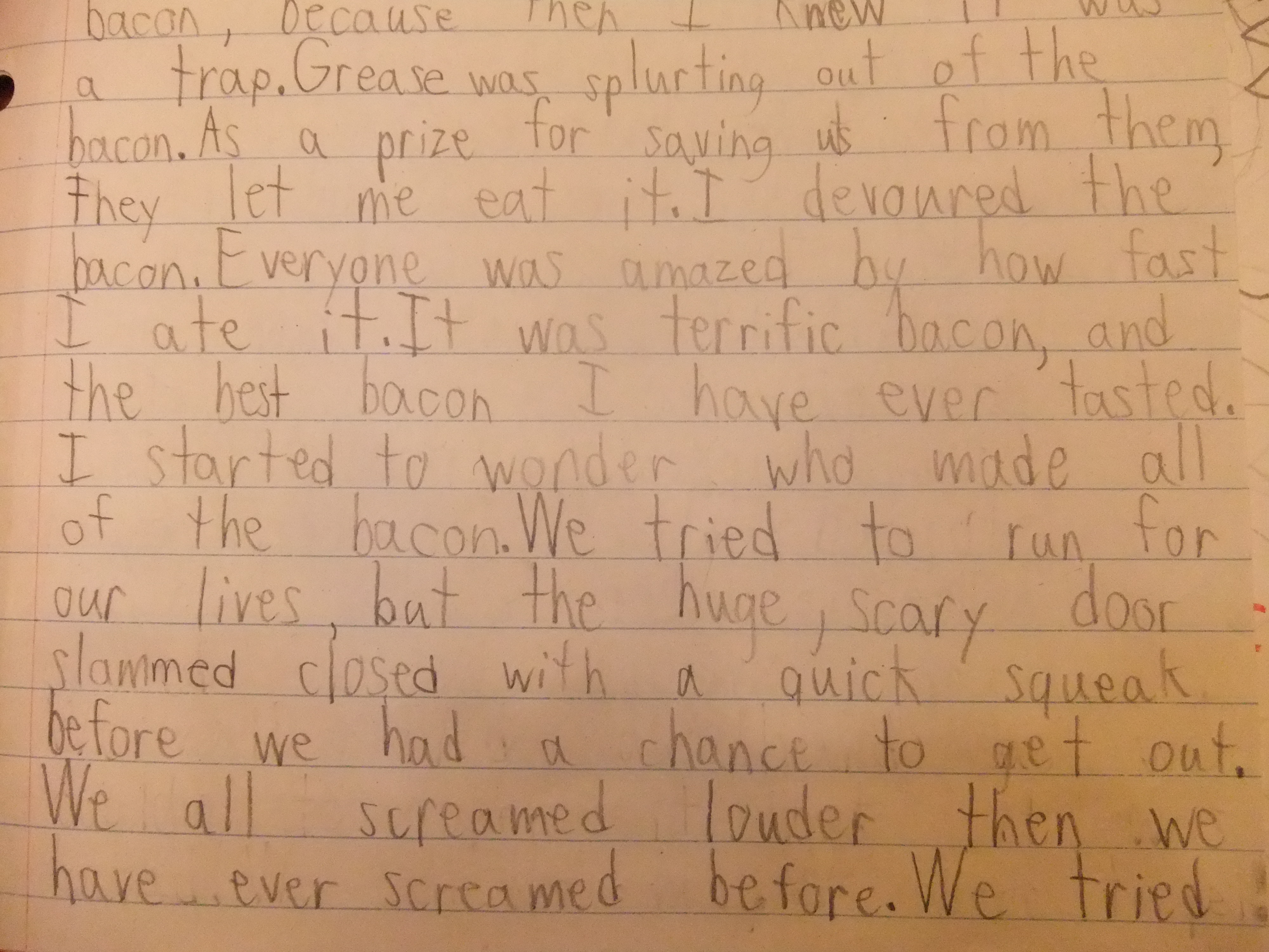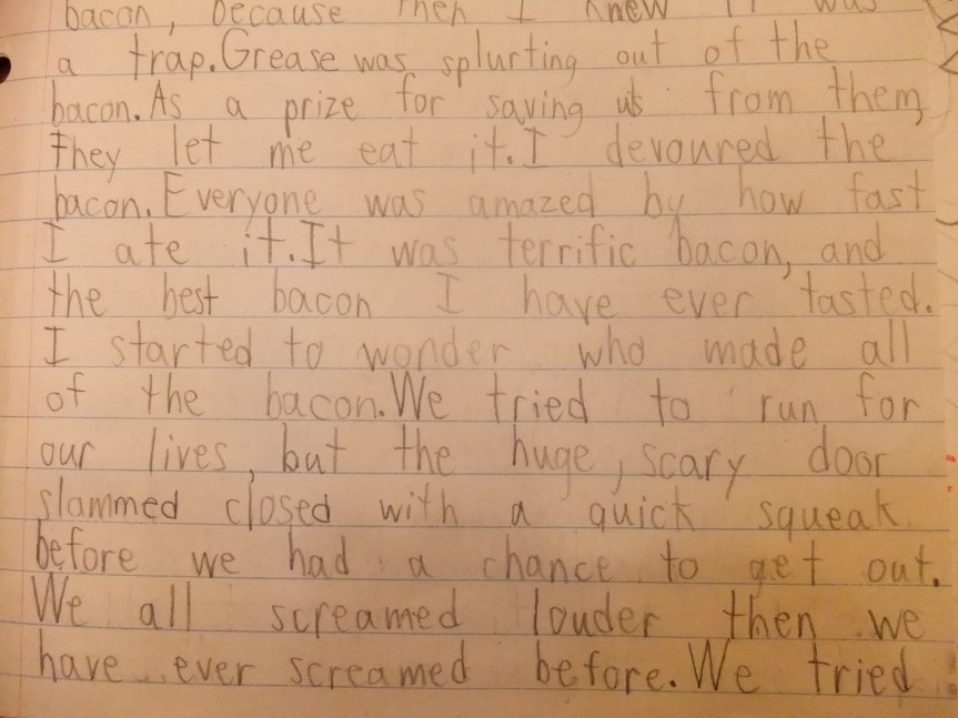 As a prize for saving us from them, they let me eat it. I devoured the bacon. Everyone was amazed by how fast I ate it. It was terrific bacon, and the best bacon I have ever tasted. I started to wonder who made all of the bacon. We tried to run for our lives, but the huge, scary door slammed closed with a quick squeak before we had a chance to get out. We all screamed louder than we have ever screamed before.