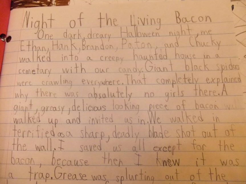 One dark, dreary Halloween night, me Ethan, Hank, Brandon, Paton, and Chucky walked into a creepy haunted house in a cemetary with our candy. Giant black spiders were crawling everywhere. That completely explained why there was absolutely no girls there. A giant, greasy, delicious looking piece of bacon walked up and invited us in. We walked in terrified as a sharp, deadly blade shot out of the wall. I saved us all except for the bacon, because then I knew it was a trap. Grease was splurting out of the bacon.