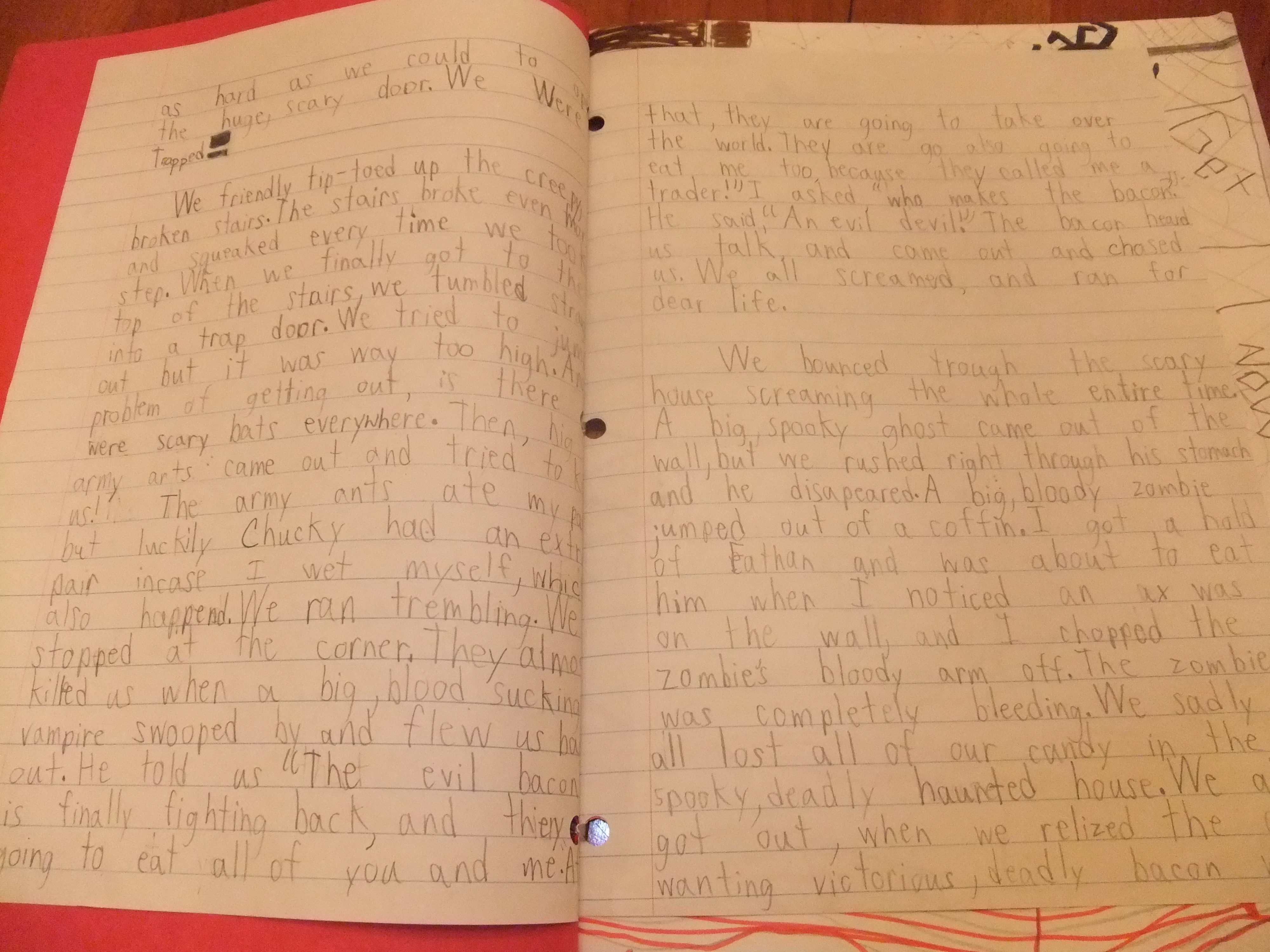We friendly tip-toed up the creepy, broken stairs. The stairs broke even more and squeaked every time we took a step. When we finally got to the top of the stairs, we tumbled straight into a trap door. We tried to jump out but it was way too high. Another problem of getting out, is there were scary bats everywhere. Then, big army ants came out and tried to kill us! The army ants ate my pants, but luckily Chucky had an extra pair incase I wet myself, which also happened. We ran trembling. We stopped at the corner. They almost killed us when a big, blood sucking vampire swooped by and flew us back out. He told us “The evil bacon is finally fighting back, and they going to eat all of you and me. After that, they are going to take over the world. They are go also going to eat me too because they called me a trader!” I asked, “who makes the bacon?” He said, “An evil devil!” The bacon heard us talk and came out and chased us. We all screamed, and ran for dear life.