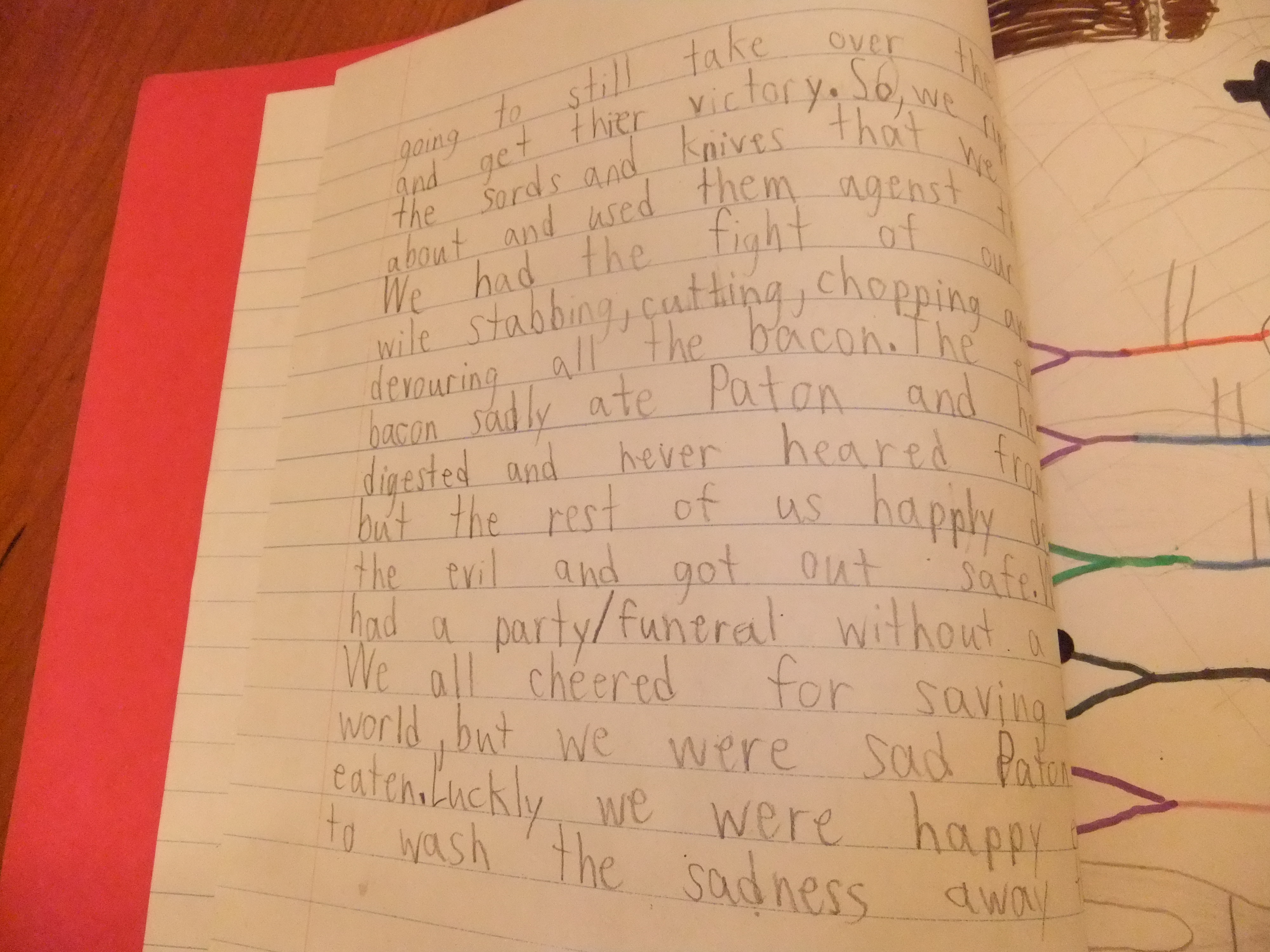 We almost got out, when we relized the evil, wanting victorious, deadly bacon was going to still take over the world and get their victory. So, we ripped out the sords and knives that we forgot about and used them agenst the bacon. We had the fight of our lives while stabbing, cutting, chopping and devouring all the bacon. The evil bacon sadly ate Paton and he was digested and never heared from again but the rest of us happily destroyed the evil and got out safe. We all had a party/funeral without a body. We all cheered for saving the world, but we were sad Paton got eaten. Luckly we were happy enough to wash the sadness away though.