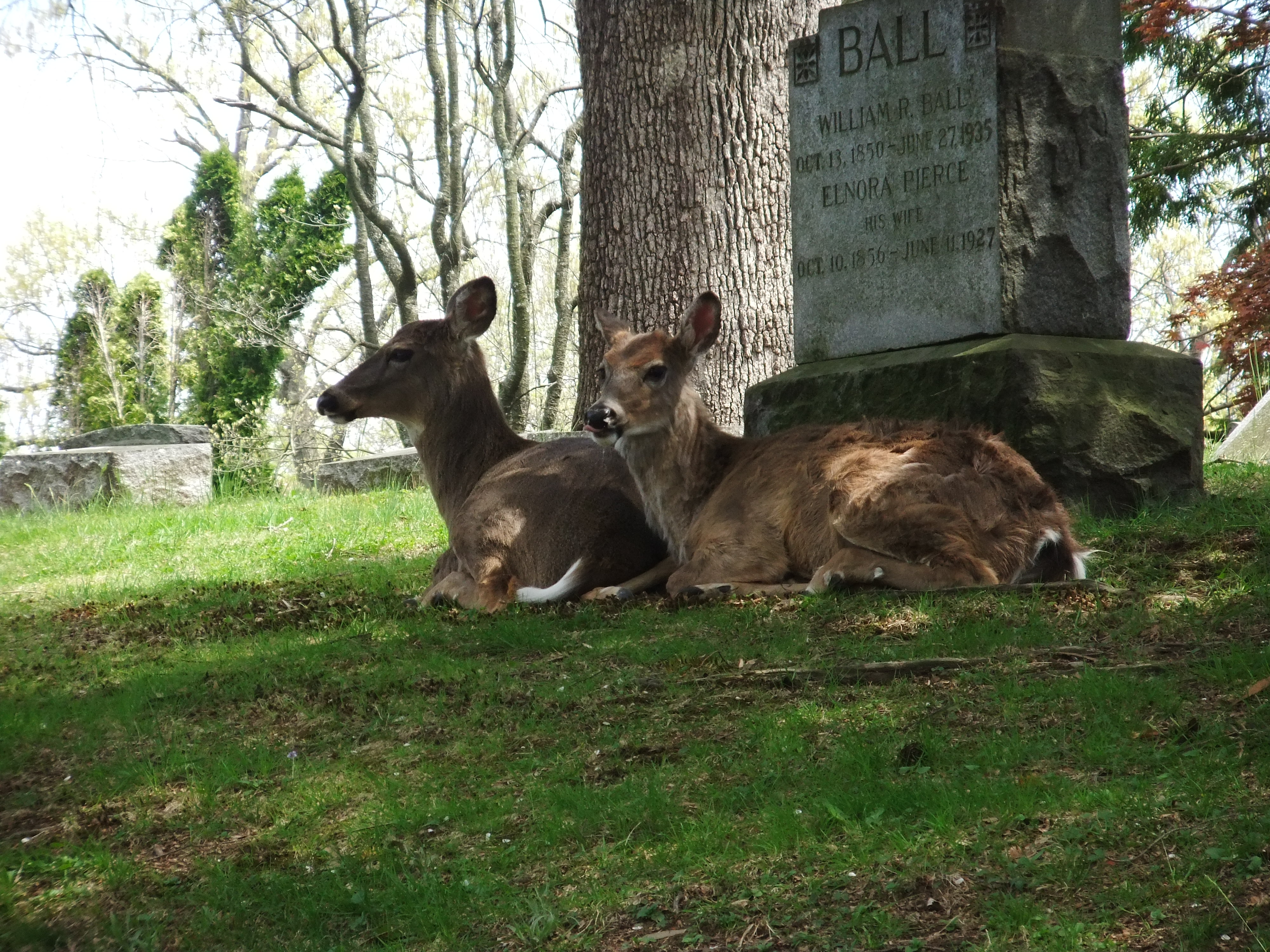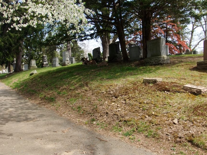 I say babies, but they’re practically grown. They were babies last year and we would see them in this part of the cemetery while we were walking the dogs. The dogs didn’t see the deer then, either.