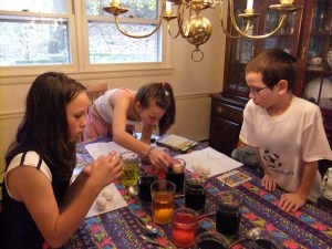 Peep Dioramas were next on the agenda, the prize up for grabs being a bag of Robin’s Eggs and some Silly Putty. The only rules were that Peeps had to be involved, and so did their Easter baskets. I guess I was envisioning small Peep scenes contained within the Easter baskets. But the term “diorama” became. . .expanded. And suddenly three teenage girls and one ten-year-old boy were madly scrambling for anything remotely resembling blocks, dolls, or action figures.