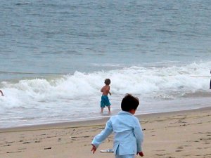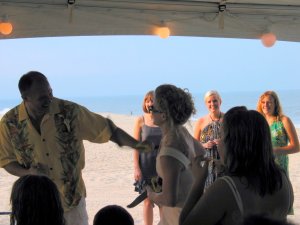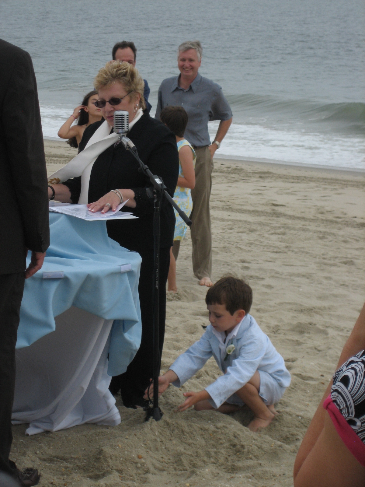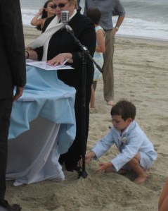 Ran away during the ceremony. Hauled ass down the beach like he was on a mission from God. We kept on, because that whole “the show must go on” thing is kind of in our blood. We knew someone would catch him and bring him back, and we were sort of occupied with trying to not laugh too much so we could still say our vows. Thank God he didn’t have the rings.