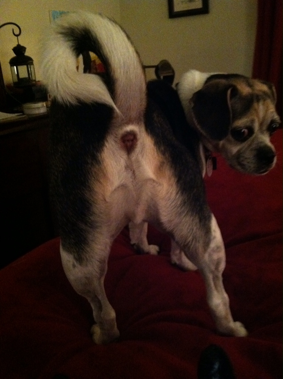 We’re not entirely sure why he climbed onto the desk in the first place. It’s not his usual middle-aged Puggle routine, climbing on things. Best we can figure is he was interested in the smells, and she’d been away from the room for like 20 minutes, so he missed her (he’s a little codependent). He left a trackable path from the desk, to her bed, to the floor, up the stairs, down the hall, to my bedroom.