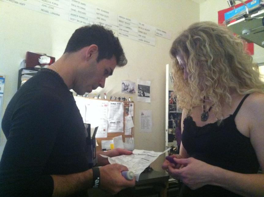 What you can’t see in the picture are the six other people in the office shouting instructions to us. We ladies were a little suspicious of the 1-AA battery design, but after loading it up and testing it on our temples to relieve headaches we figured it probably would do the job after all.